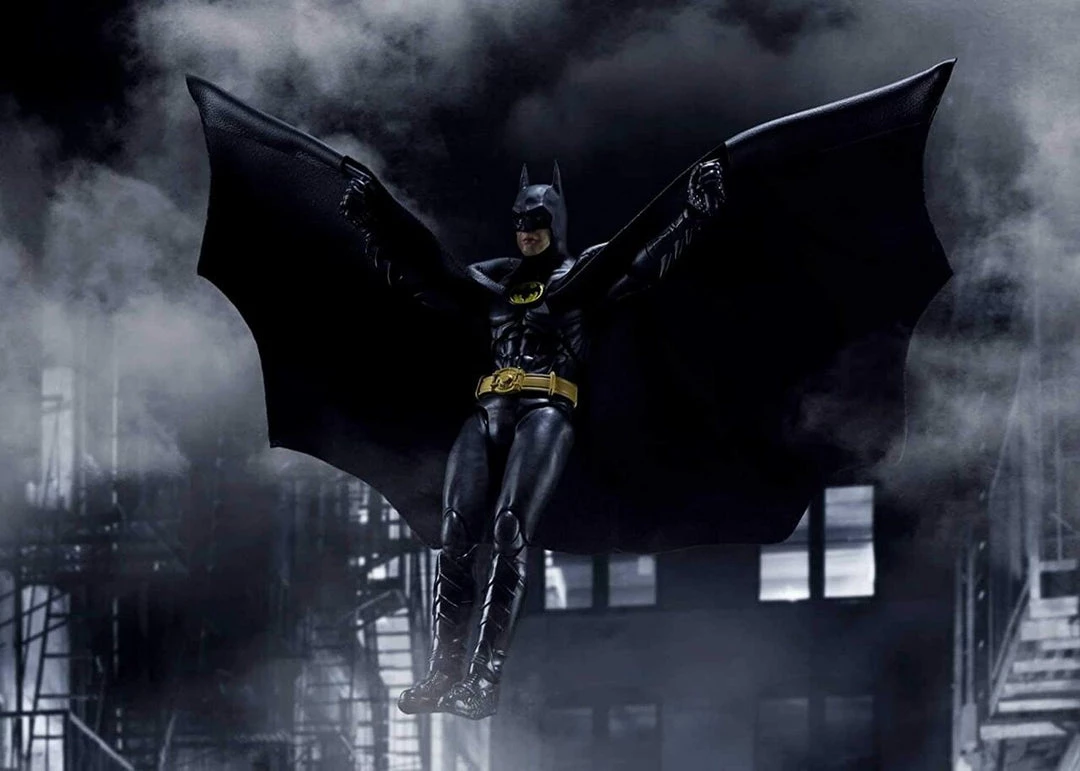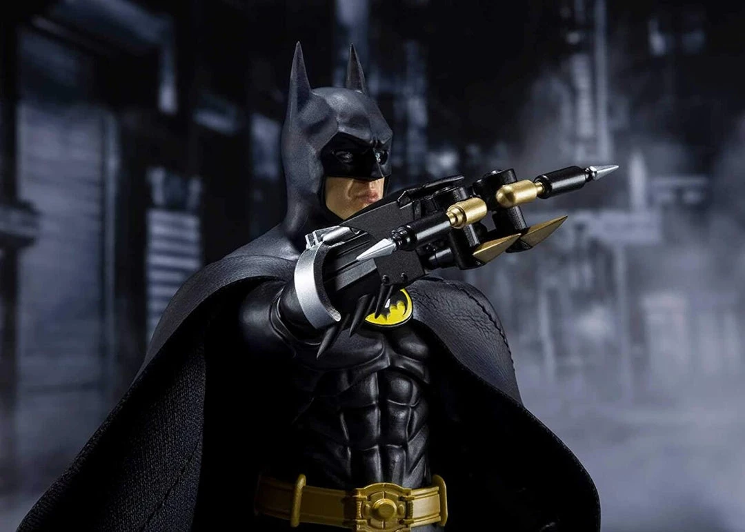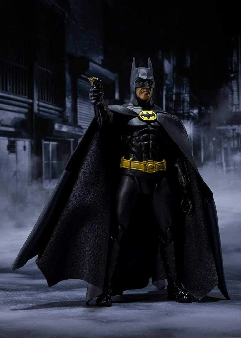 A new S.H.Figuarts from the 1989 worldwide hit film Batman! His eyes come to life with realistic coloring under a mask replicated with rubber like materials. The fabric cape comes with support rods to recreate Batmans impressive gliding poses. Batman also comes with a wide range of extra parts including the Batarang. The set includes an optional head part, four left and five right hand parts, Grappling gun, Gauntlet, two Shurikens, a Batarang, two cape support rods.Â