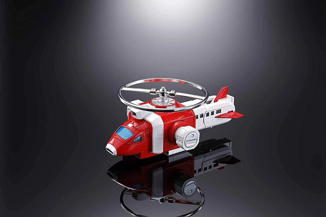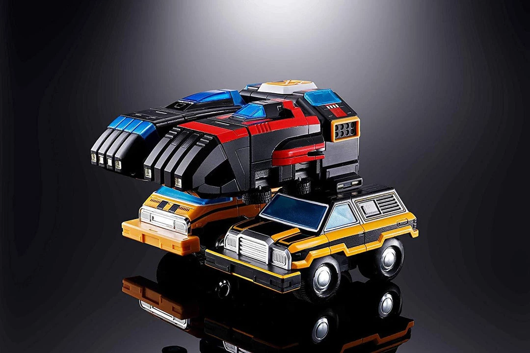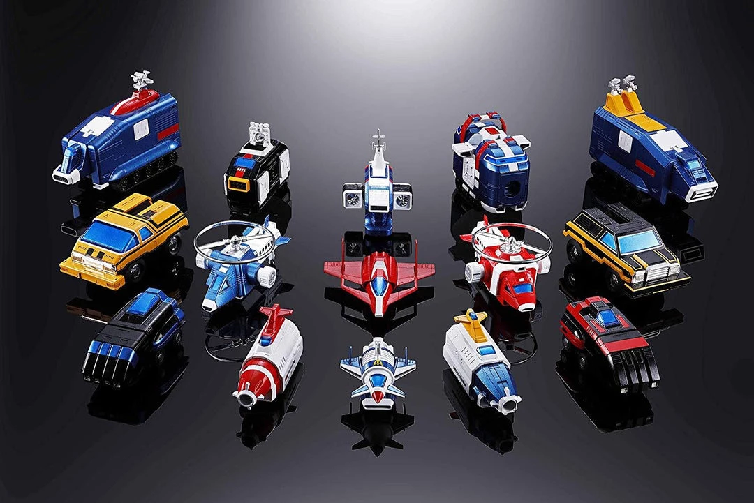 Faithfully forms into the three air, land, and sea team combat modes The Super-size set includes: #1 Command jet Explorer; #2 strato weapons module; #3 air Recon helicopter #4 air Recon helicopter 2 #5 Falcon VT fighter; #6 Communications module; #7 space prober; #8 space prober; #9 multi-wheeled explore #10 multi-wheeled explore; #11 Jet radar station; #12 rotating personnel carrier; #13 armored equipment Carrie; #14 all-terrain space vehicle; a stand; and two nameplates.