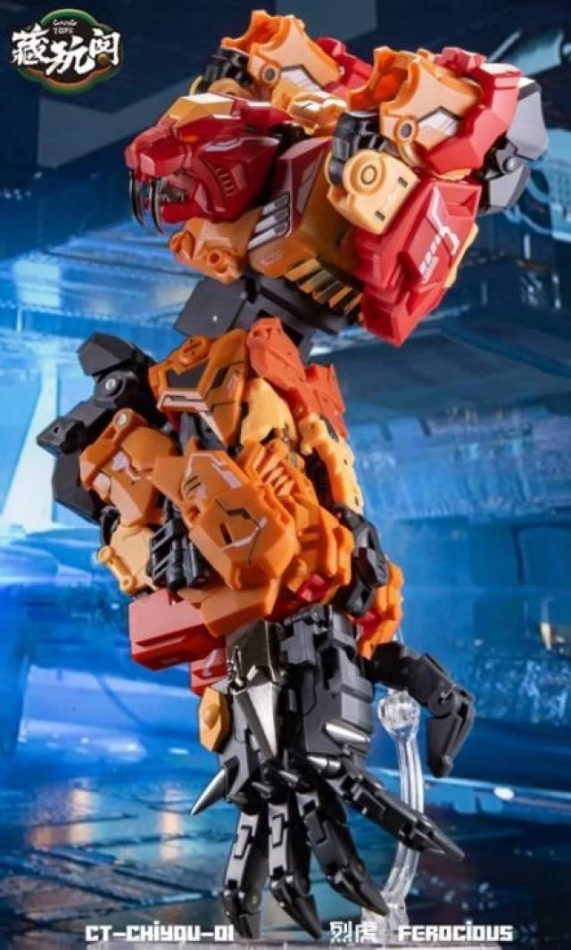 The first in the Cang-Toys’ transforming figure series – CT-Chiyou-01 Ferocious! Convert this beast-like creature into two forms: standing robot, or the right arm of a larger combining figure. Ferocious stands about 9 inches tall while in robot mode; weaponry includes a cannon and sword. Â