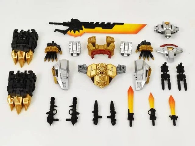 Included ins this set are upgraded feet, chest plate, head, hands, back armor, waist armor, hip armor, leg armor, shoulder plates, 6 individual figure guns, 3 individual swords and 1 large combiner sword!