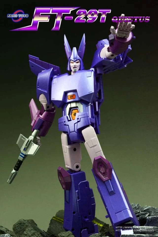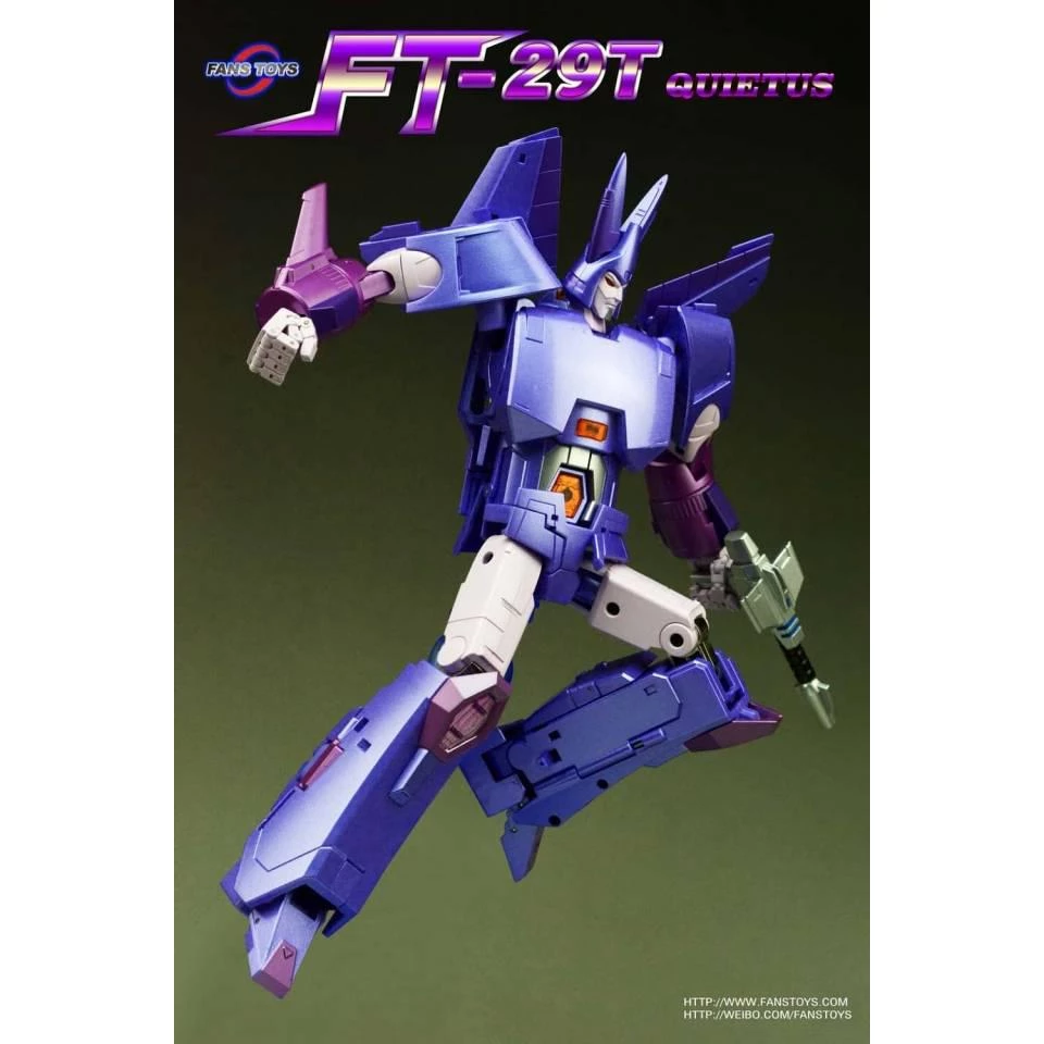 Fans Toys FT-29T Quietus – This masterpiece-scaled figure measures approximately 24cm tall, and contains die-cast parts. He is highly articulated, and converts from futuristic space plane, to robot, and back. Includes a target warrior weapon which transforms from a holdable gun to a mini robot! Figure also includes a rifle, two katanas, multiple expressive face plates, and more!