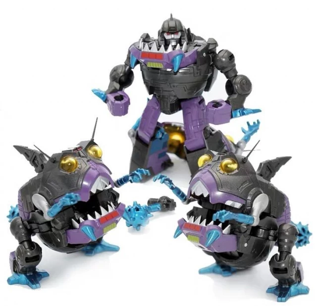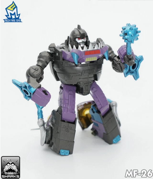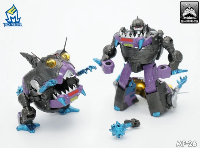From Mech Fans Toys, the MF-26 Sharkticons Set of 3ย figures standย a little over 3ย inches tall each, legends scaled, and can transform from robots to sharks and back!