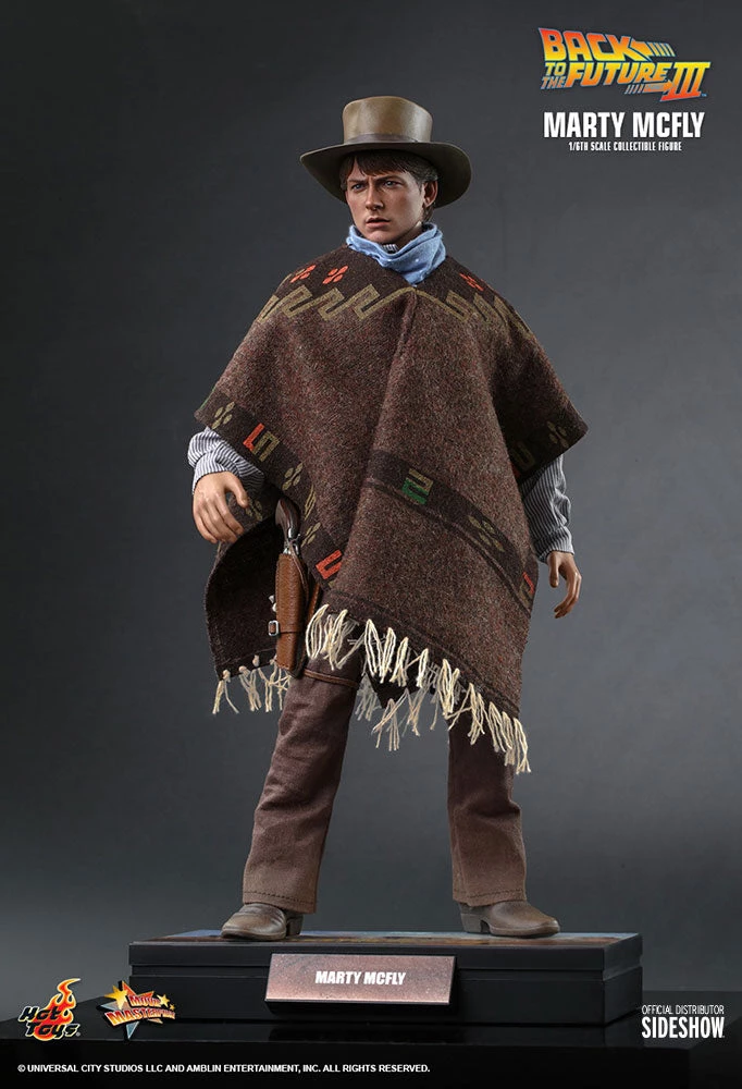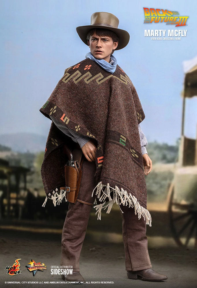 The stunningly detailed collectible figure is specially crafted based on the appearance of Michael J. Fox as Marty McFly in Back to the Future III, featuring a newly developed head sculpt and a cowboy hat with amazing likeness, screen accurate costume, a brown patterned poncho, cowboy scarf, an array of weapon and accessories including a pistol, bulletproof stove plate, pie dish, framed photo from Doc Brown, photo of Doc’s tomb, communicator with battery, hoverboard, and a figure stand!