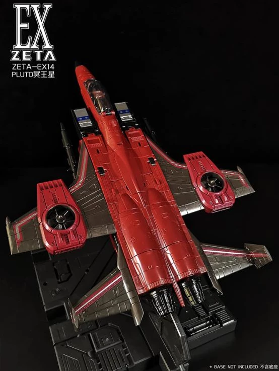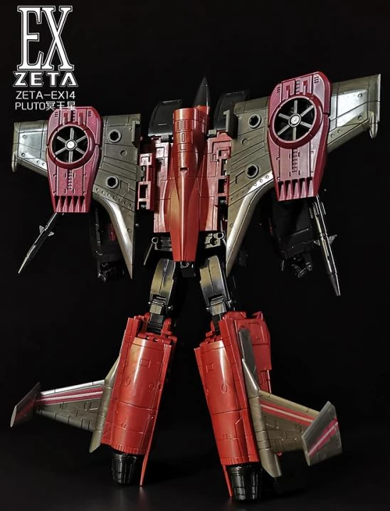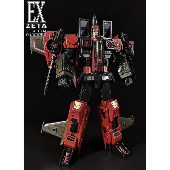The Zeta EX14 Pluto is a limited edition masterpiece Scale scaled figure that converts from a fighter jet to robot and back.ย Pluto stands approx 8.5 inches tall in robot mode.ย Comes with weapons and accessories.ย